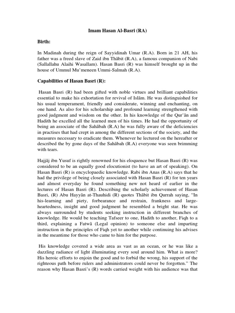 Hasan basri (rahimahullah) had been gifted with noble virtues and brilliant capabilities essential to make his exhortation for revival of islãm. He was known to his own generation as an eloquent preacher, a paragon of the truly pious muslim, and an outspoken critic of the political rulers of the umayyad dynasty. I had always wished to see a friend or dear servant of allah, either while awake or in a dream, so. Contact imam hasan al basri on messenger. He was among tabien and the salaf generation.